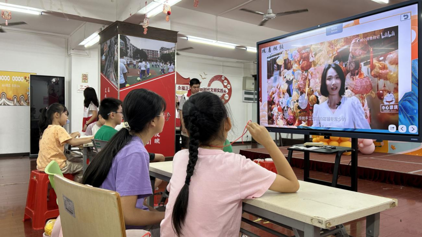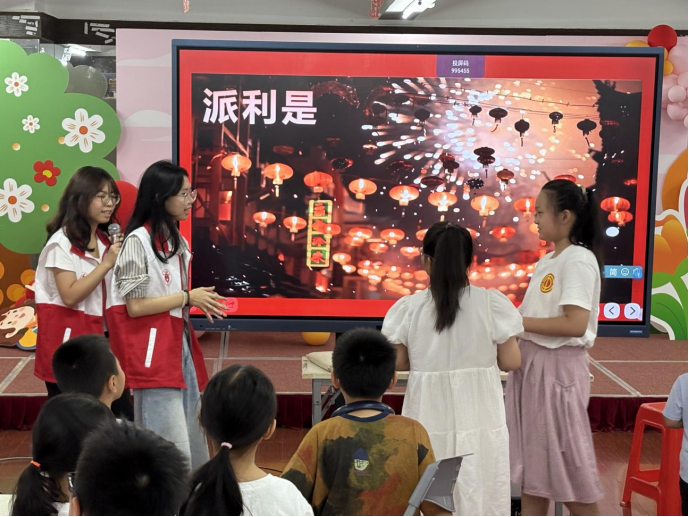 在“你画我猜”游戏中,有人画挥春的红色卷轴,有人画赛龙舟的激烈场景,有人画圆圆的月饼。当屏幕上出现月饼的图像时,孩子们几乎异口同声地喊出“中秋”,随着粽子、花灯等元素依次呈现,孩子也迅速猜出相对应的节日。随后的故事分享环节,志愿者化身“讲古人”,用生动易懂的语言解读传统。“学一句福,暖一家人”,广府传统文化的种子在悄然播撒。